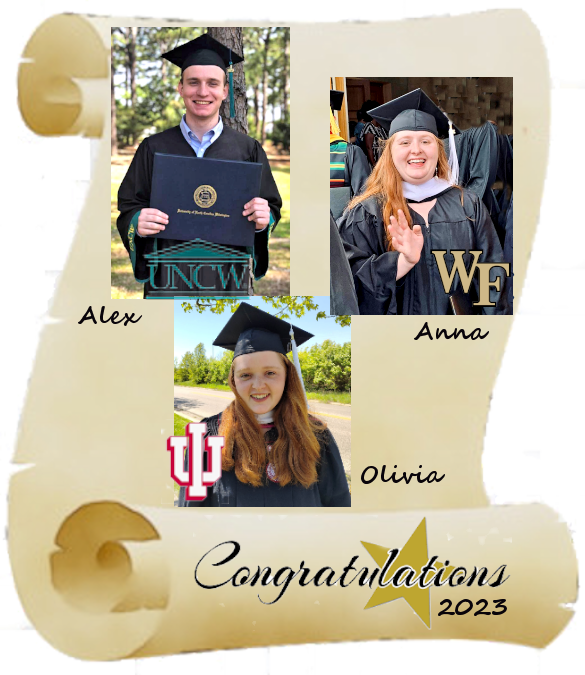 Congratulations to our 2023 college grads: Alex Freeman, from UNC Wilmington; Anna Phillips, from Wake Forest, and Olivia Phillips from Indiana University.
